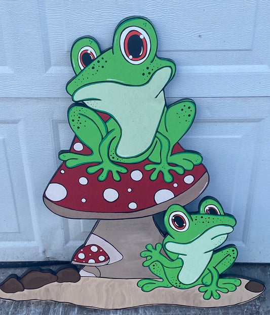 Frogs On Mushroom Wood Outdoor Yard Art Sign, Frog Garden Decoration