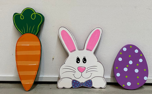 Easter Bunny Wood Yard Art or Plant Poke, Easter Decorations, Easter Egg, Carrot, Set of 3
