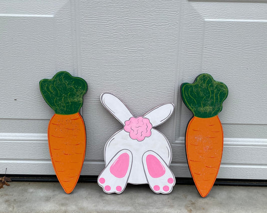 Easter Bunny with Carrots Wood Yard Art or Plant Poke, Easter Decorations, Easter Egg, Carrot, Set of 3