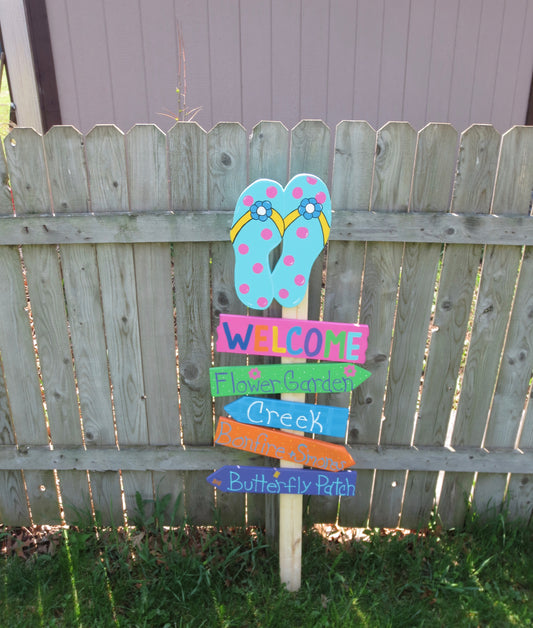 FLIP FLOP WELCOME DIRECTION SIGN, WOOD OUTDOOR YARD ART