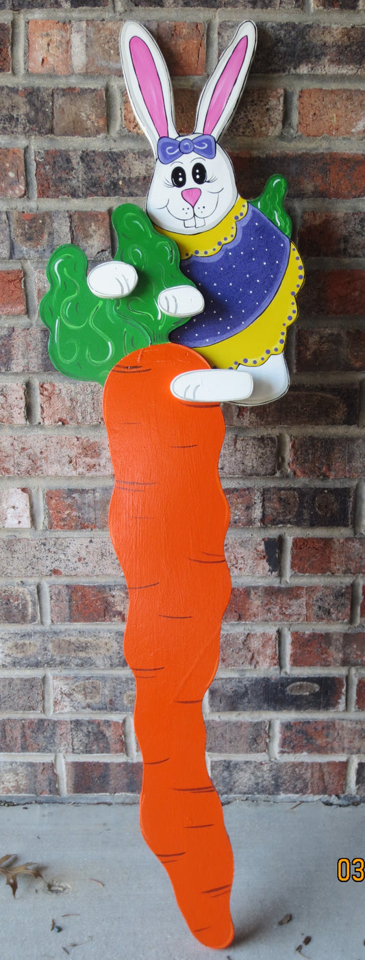 EASTER BUNNY SITTING ON CARROT WOOD OUTDOOR YARD ART SIGN