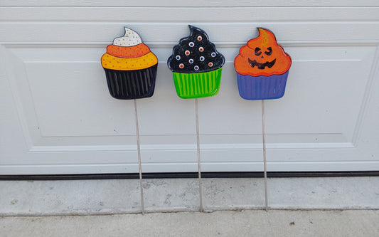 Halloween Cupcakes Candy Corn, Pumpkin, Wood Outdoor Yard Art Sign, Scary Cute Cupcake Lawn Decorations, Garden Stake, Plant Pokes, Set of 3