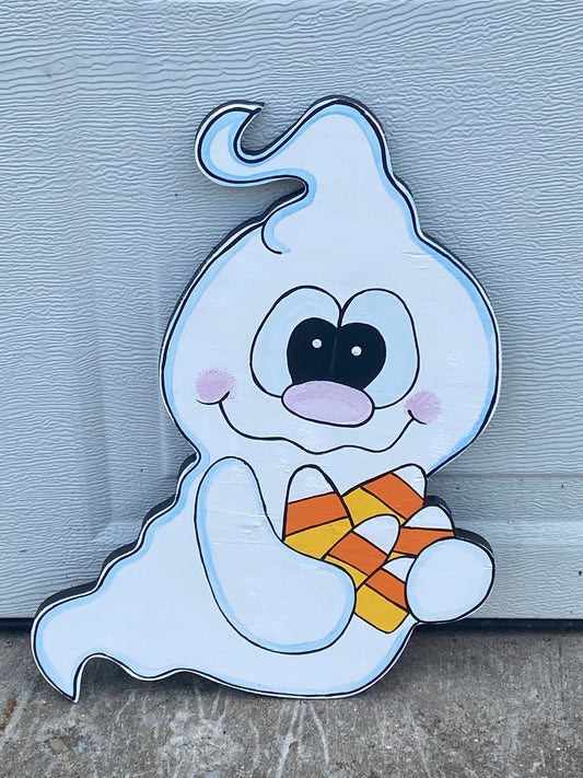 Halloween Ghost With Candy Corn Wood Yard Art Decoration, Ghosts Outdoor Yard Sign