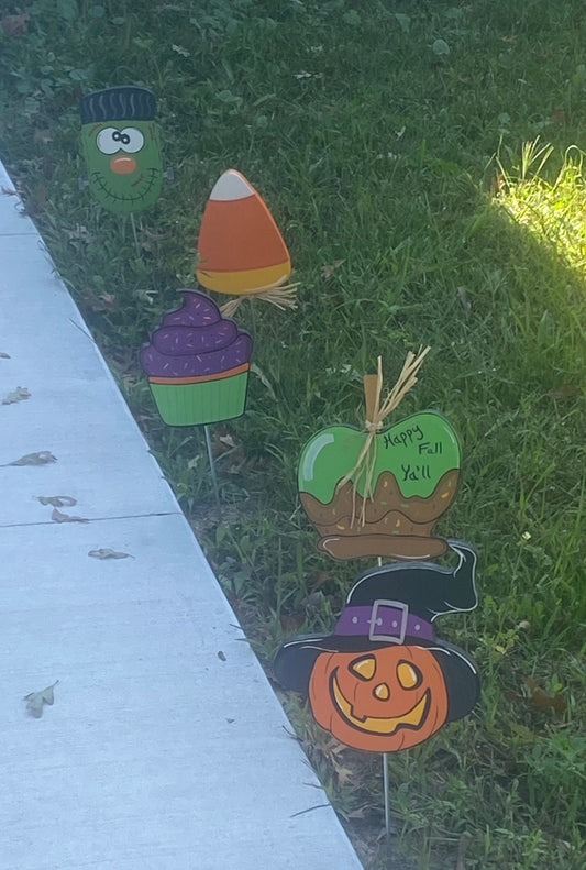 Halloween Plant Pokes, Set Of 5, Candy Corn, Frankenstein, Walkway Wood Outdoor Yard Art