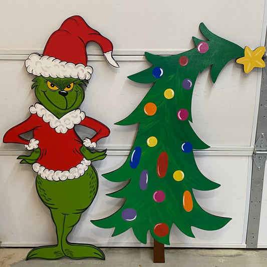Grinch with Christmas Tree Whoville Wood Outdoor Yard Art Sign, Christmas Decor