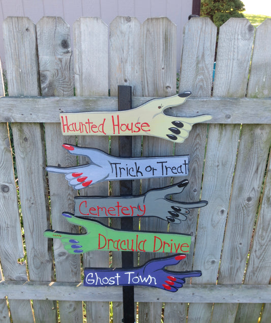 HALLOWEEN DIRECTIONAL HAND WOOD OUTDOOR YARD ART SIGN, HALLOWEEN DECORATION, HAUNTED HOUSE, TRICK OR TREAT